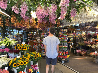 Ils commencent par le marché, assez excentré, qui propose des stands de nourriture en tout genre et des vêtements. Arrivés au centre, ils garent leurs vélos sur une barge utilisée uniquement comme parking à vélos. Ils partent au marché aux fleurs, qui lui aussi se situait sur une barge accostée au quai. Les garçons sont étonnés car les marchants vendent en majorité des bulbes, par douzaine ou demi-douzaine. Ils continuent leur route et s'arrêtent dans un magasin de gouda où ils font une petite dégustation : gouda nature, gouda à la viande fumée, gouda à la truffe, ... Cette dernière leur ouvre l'appétit, ils décident d'aller manger. Au passage, ils tombent devant un coffee shop et décident d'y rentrer. Une fois installés, ils regardent le menu, et sont surpris : la carte propose une multitude de variété de cannabis et renseigne les effets qu'elles procurent, cela semble professionnel. En ressortant (je précise : sans avoir consommé), les garçons sont contents d'en avoir fait l'expérience. Les coffee shop sont difficiles à trouver puisqu'ils sont souvent dans des ruelles mais l'odeur prend au nez dès que l'on passe la porte, l'ambiance est sympa sur un fond de reggae.